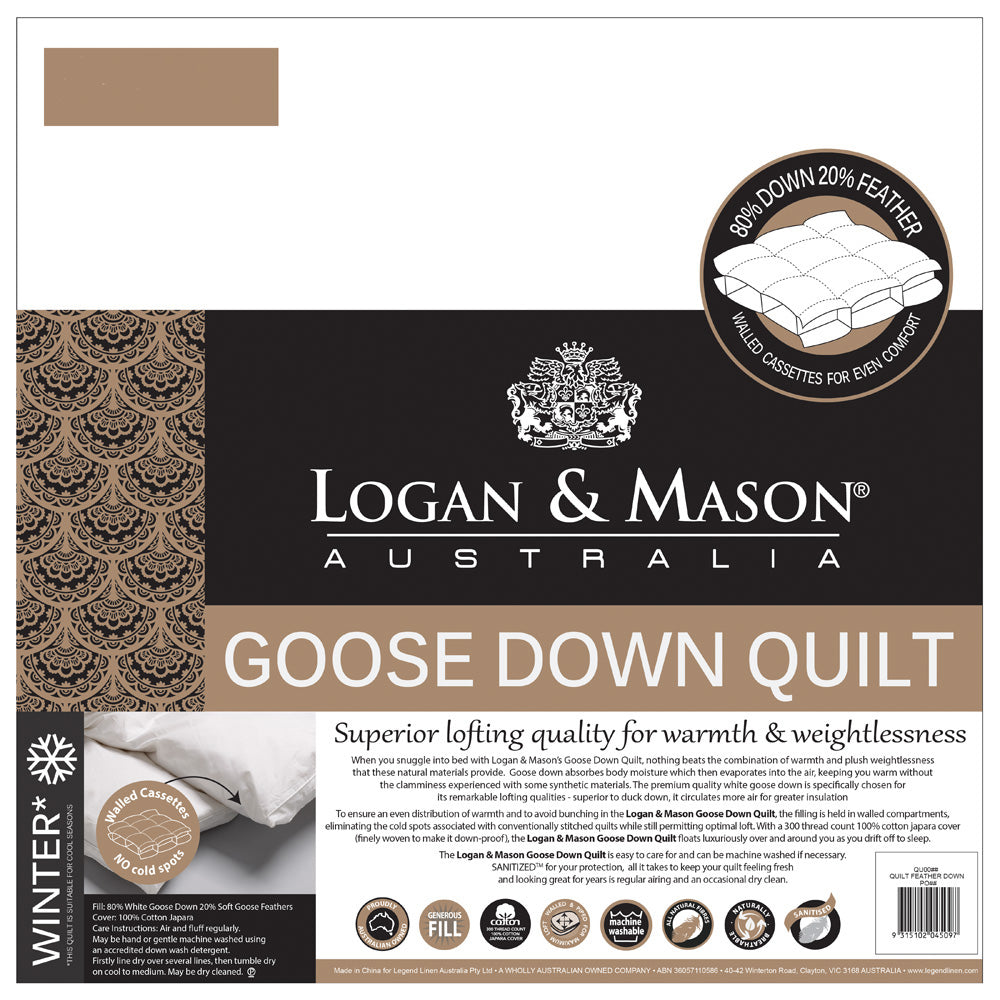 When you snuggle into bed with Logan & Mason’s 80/20 Goose Down & Feather Double Bed Quilt, nothing beats the combination of warmth and plush weightlessness that these natural materials provide. Goose down absorbs body moisture which then evaporates into the air, keeping you warm without the clamminess experienced with some synthetic materials. The premium quality white goose down is specifically chosen for its remarkable lofting qualities - superior to duck down, it circulates more air for greater insulation. To ensure an even distribution of warmth and to avoid bunching, the filling is held in walled compartments, eliminating the cold spots associated with conventionally stitched quilts while still permitting optimal loft. With a 300 thread count 100% cotton japara cover (finely woven to make it down-proof), the quilt floats luxuriously over and around you as you drift off to sleep.