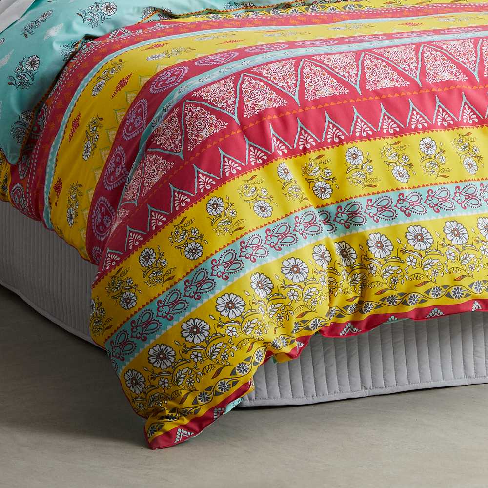 Logan and Mason Adhira Summer Double Bed Quilt Cover Set brings boho-chic to the bedroom. Panels of Indian inspired motifs exude a festival style ambience in spicy colours of yellow and pink. The mint reverse features a floral pattern for turn-back contrast enhanced by piped edges to amplify this colour-on-colour story.