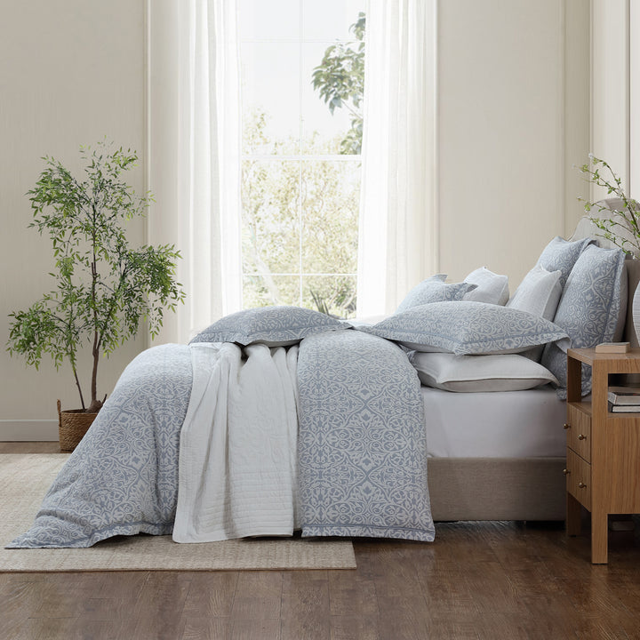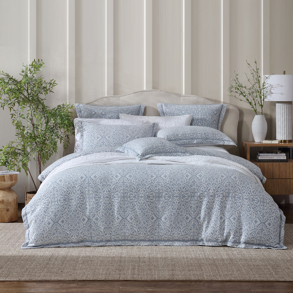 Introducing Althea Denim Super King Quilt Cover Set, a beautiful fusion of tradition and modernity. Featuring a classic damask pattern intricately woven in a cotton jacquard, Althea showcases a contemporary colour palette of soft denim blue and crisp white. The addition of a matte herringbone tape, adds a refined touch, enhancing the overall elegance and sophistication of this timeless piece. Perfect for those seeking to elevate their bedroom decor with a blend of classic charm and modern style.