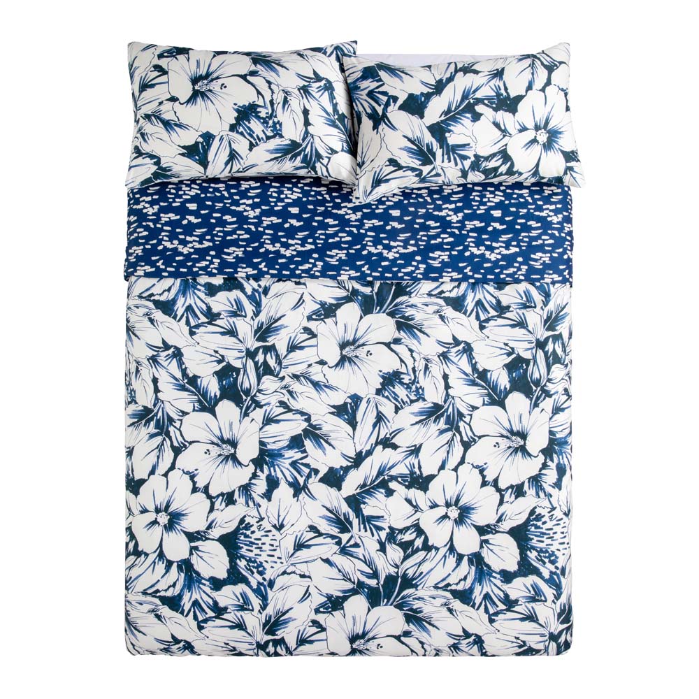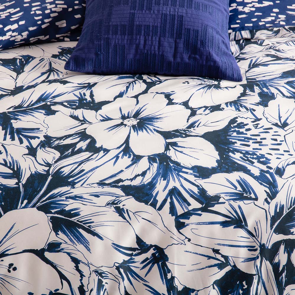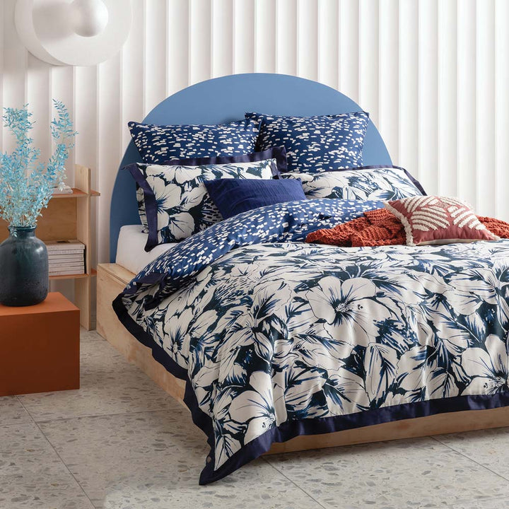 KAS Alto Double Bed Quilt Cover Set brings a Hawaiian-inspired print into your bedroom. Featuring sprawling tropical flowers, printed on cotton sateen in a deep blue ocean hue and bordered by a statement flange, the linear patterned reverse will help you drift into dreams of moonlit reflections on soothing ocean waves.