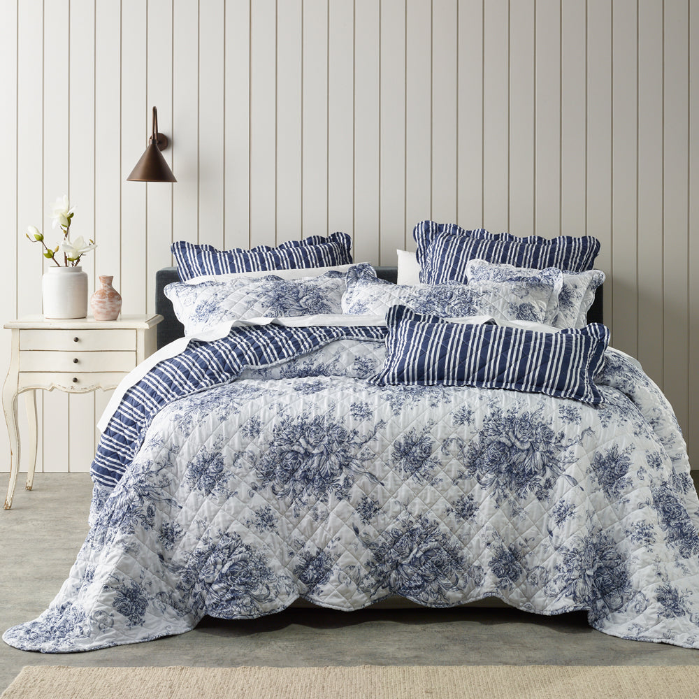 Bianca Amorette Blue King Single Bed 5 piece Bedspread Set is a stunning French Provincial inspired bedspread that features a scalloped edge. Traditional blue hues contrast beautifully on a white background. The bedspreads coordinate stripe printed reverse, also features on the european pillowcases and cushion.