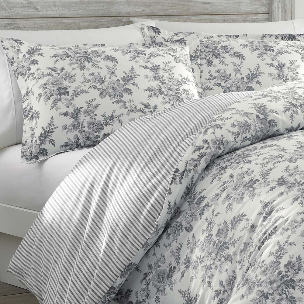 Laura Ashley Annalise Single Bed Quilt Cover Set features an elegant, yet casual, floral toile with shirting stripe accents. This modern neutral palette of pearl grey and white will transform your bedroom into a relaxing retreat. Set includes quilt cover and one pillowcase featuring a tailored edge.