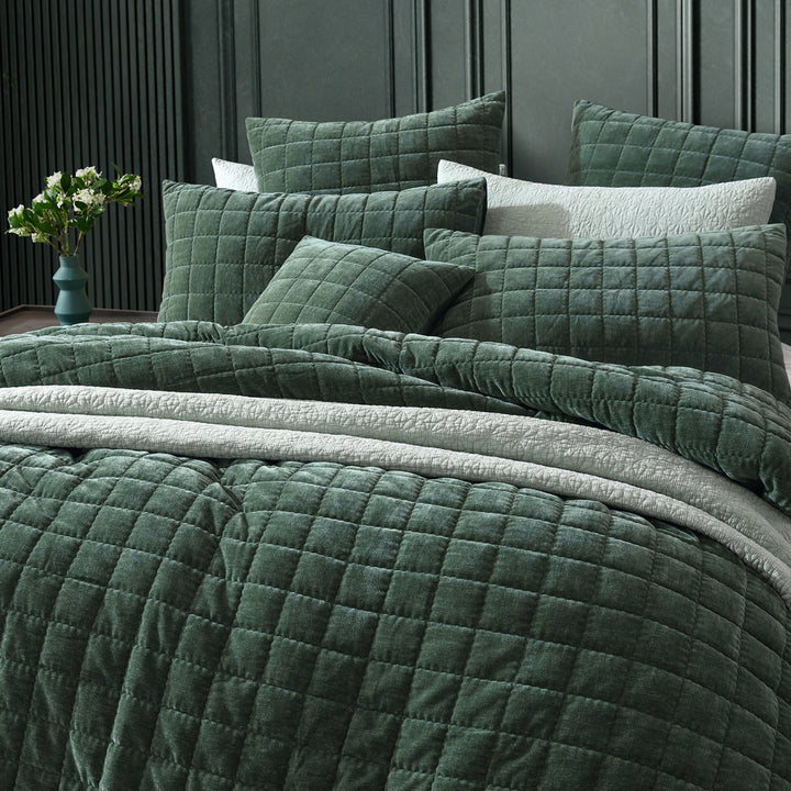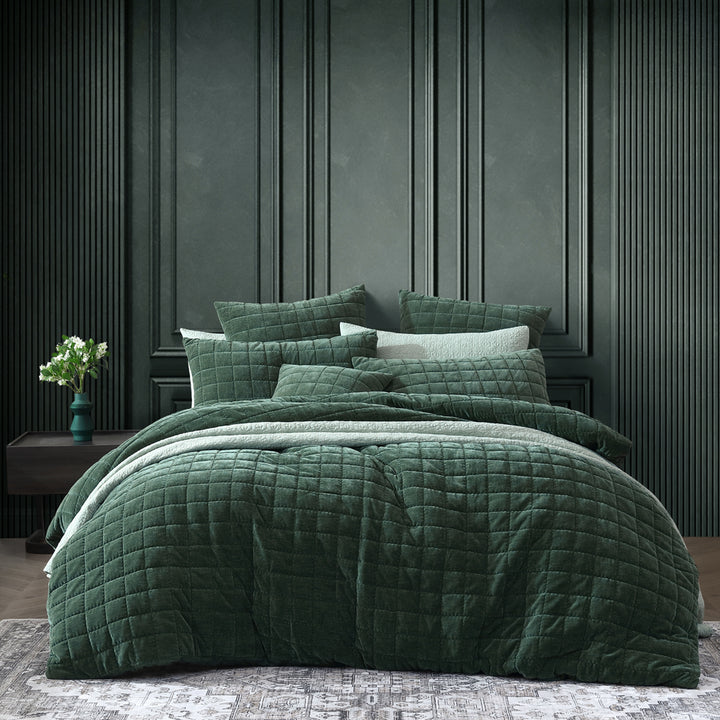Platinum Logan and Mason Apollo Cilantro Queen Bed Quilt Cover effortlessly combines sophistication, style, and elegance. Crafted from plush chenille velvet, it offers a luxuriously soft feel. The simple check pattern is accentuated by a delicate wave stitch, while bold royal hues of cilantro green and plum purple add a vibrant pop of colour to any interior.