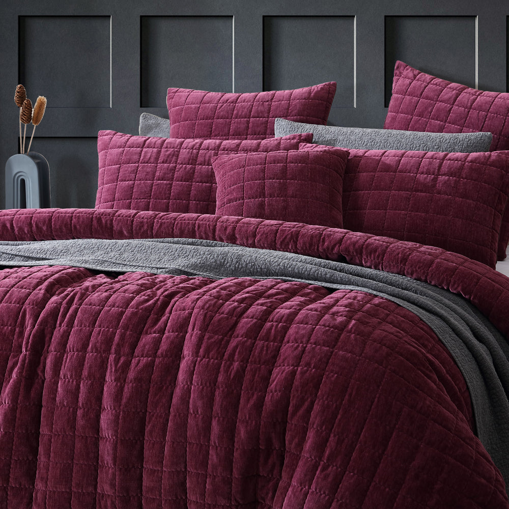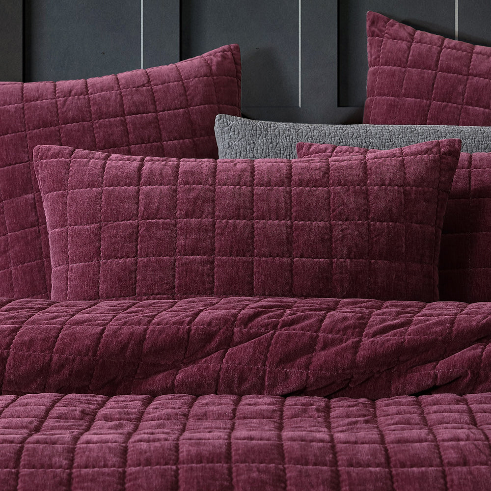 The Apollo Plum Super King Quilt Cover Set effortlessly combines sophistication, style, and elegance. Crafted from plush chenille velvet, it offers a luxuriously soft feel. The simple check pattern is accentuated by a delicate wave stitch, while bold royal hues of cilantro green and plum purple add a vibrant pop of colour to any interior.