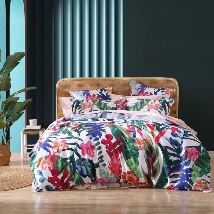 Logan and Mason Atherton Tropic King bed quilt cover set, a vibrant and captivating fusion of tropical allure and modern sophistication. Immerse yourself in the lush beauty of over-scaled painted jungle leaves in an array of bright, lively colours that breathe life into your bedroom. The reverse side, a silhouette of foliage in soothing lilac and white tones provides a serene and elegant contrast to the bold front. This understated yet artistic design adds a touch of modernity and versatility, allowing you to switch between the lively vibrancy of the jungle leaves and the calm sophistication of the silhouette, depending on your mood or decor preferences.