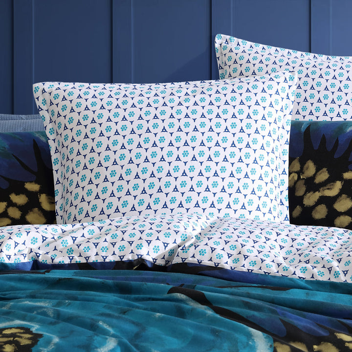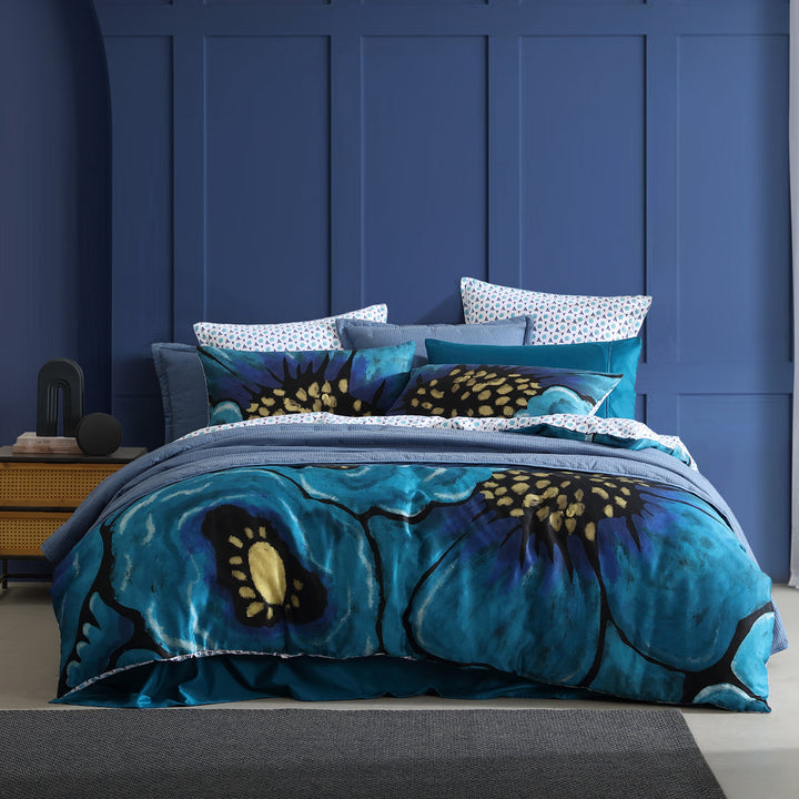 Logan and Mason Avalon Blue Queen bed quilt cover set invites you to explore and express your artistic flair with its captivating design. Embrace a fusion of creativity and elegance through its oversized, hand-painted floral motif that sprawls across the cover. The design, in a stunning array of blues and teals complemented by vibrant pops of yellow, contrasts beautifully against a sophisticated black backdrop. Crafted to inspire, the hand-drawn geometric print on the reverse side mirrors the hues and tones of the front. alternative.