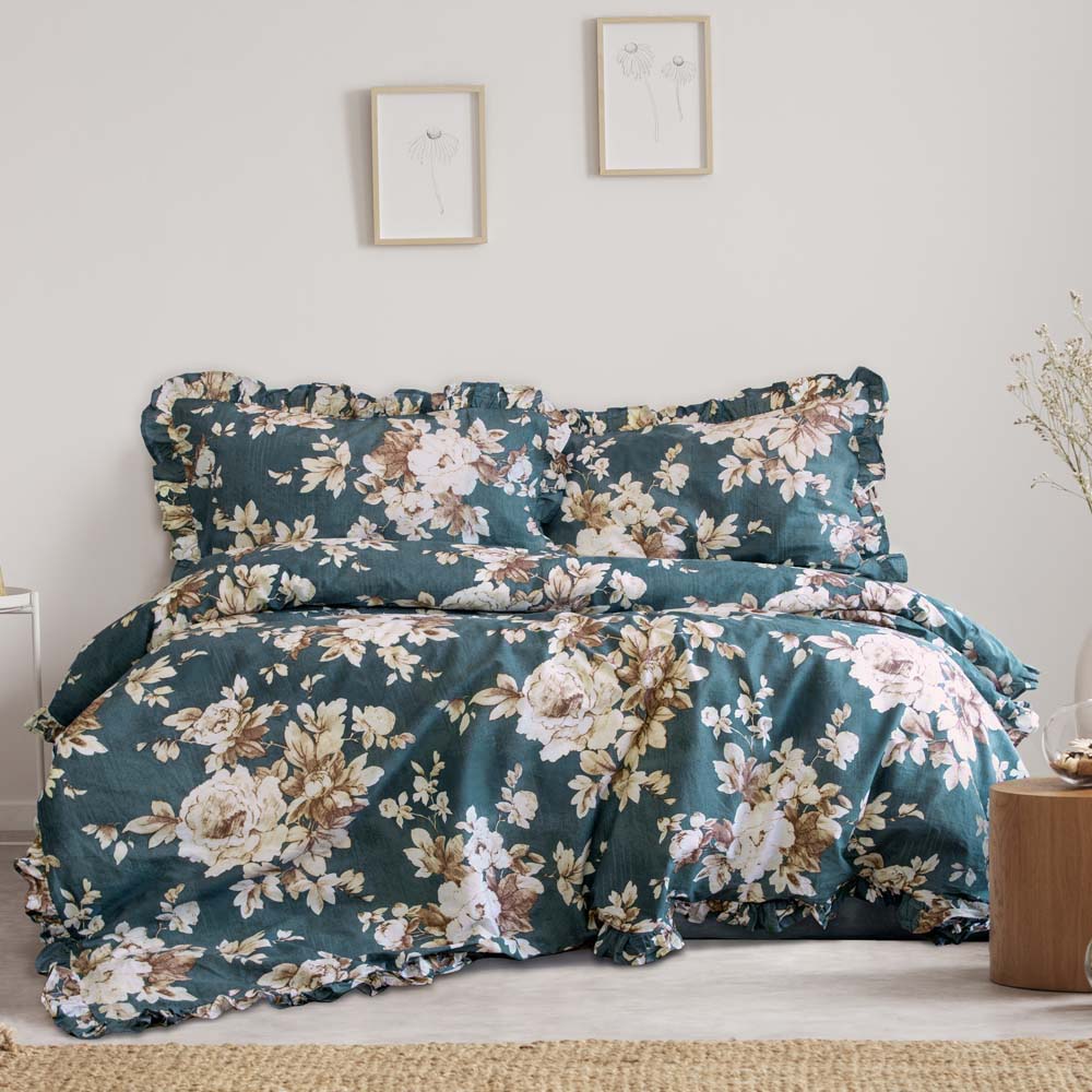 Ardor Ayla Teal King Bed Quilt Cover Set brings a touch of bold yet soft femininity to your room. This quilt cover set features a deep teal ground paired with florals details to create this stylish look. Finished with a ruffled trim, this floral classic is sure to impress.