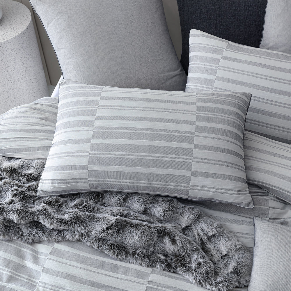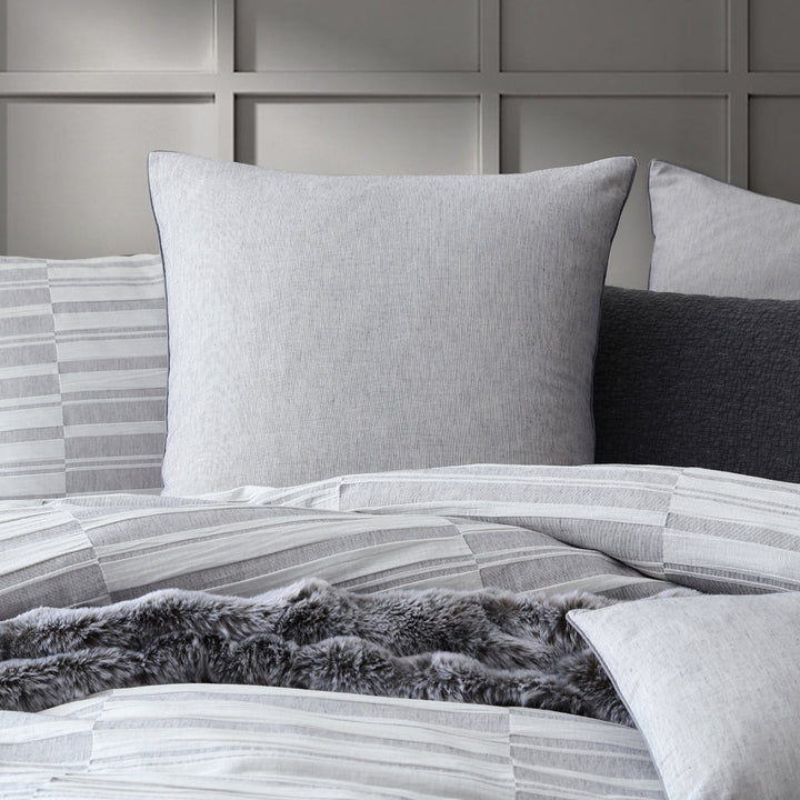 Platinum Logan and Mason Balmoral Ash King Bed Quilt Cover enhancing the modest check with textures and stripes. Balmoral combines woven techniques of plain weave and seersucker to create a dramatic design. The oversized scale will become a focal point within your bedroom. The simple coordinating fabric highlights the woven plain weave, paired with a piped edge makes for a curated collection.