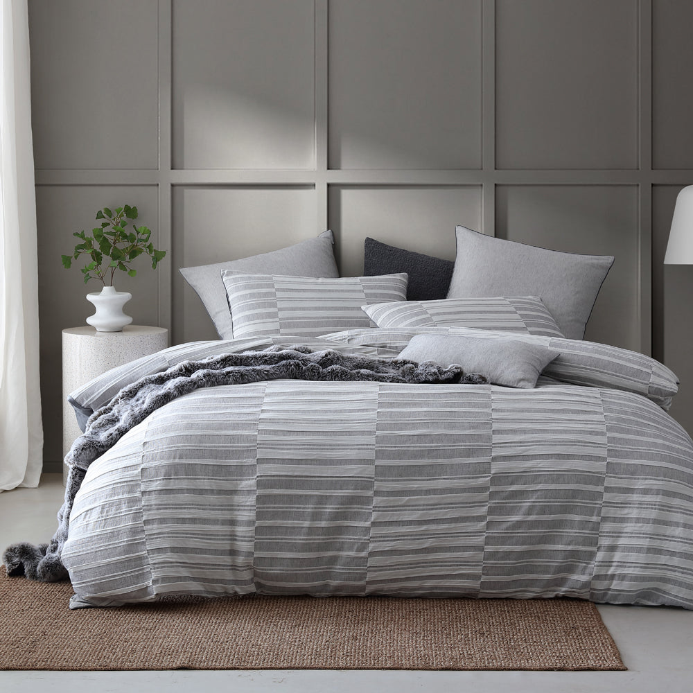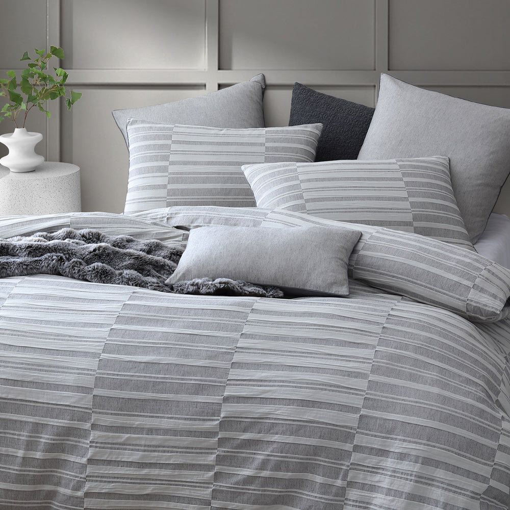Platinum Logan and Mason Balmoral Ash Super King Quilt Cover enhancing the modest check with textures and stripes. Balmoral combines woven techniques of plain weave and seersucker to create a dramatic design. The oversized scale will become a focal point within your bedroom. The simple coordinating fabric highlights the woven plain weave, paired with a piped edge makes for a curated collection.