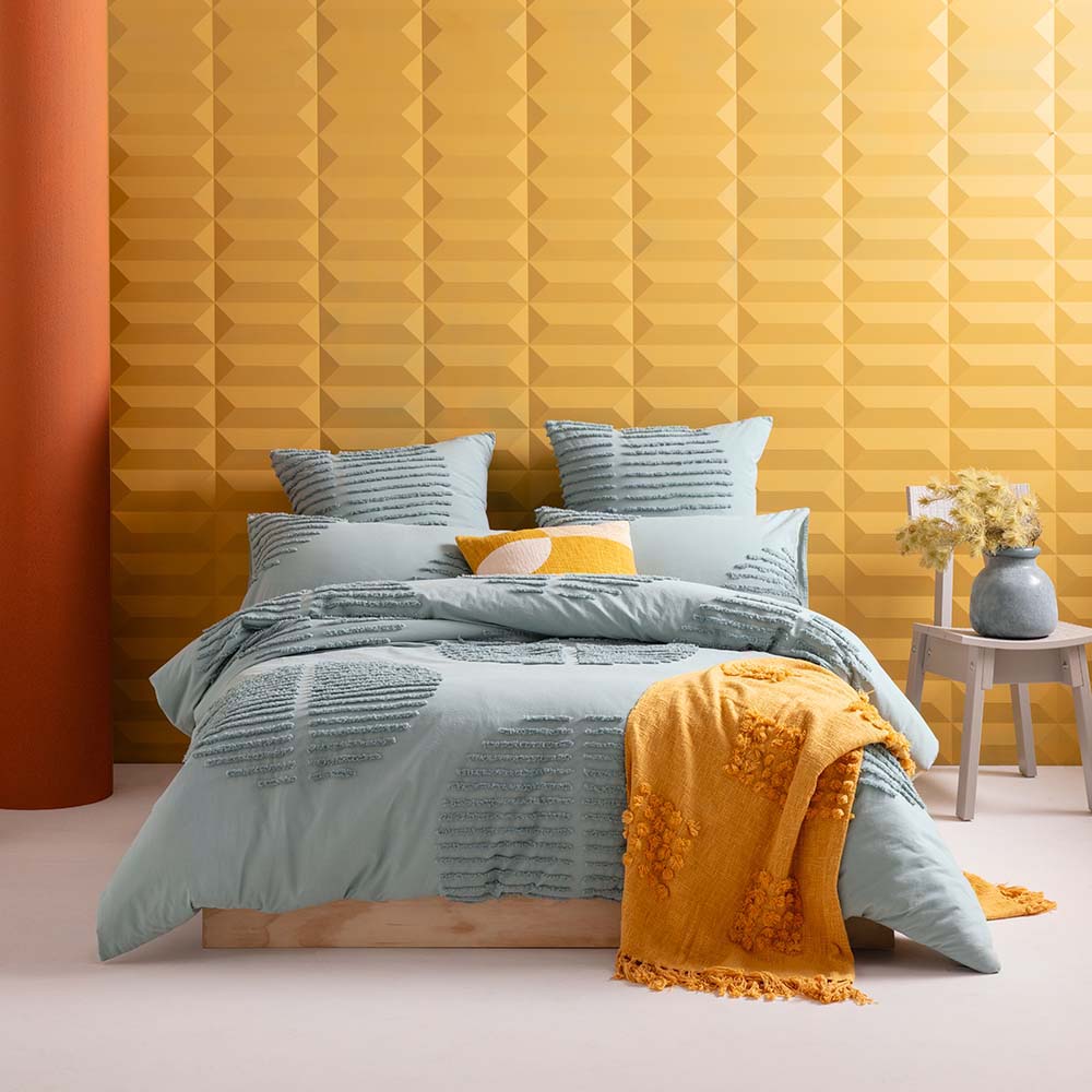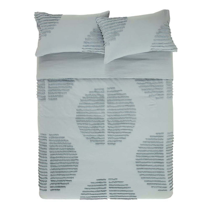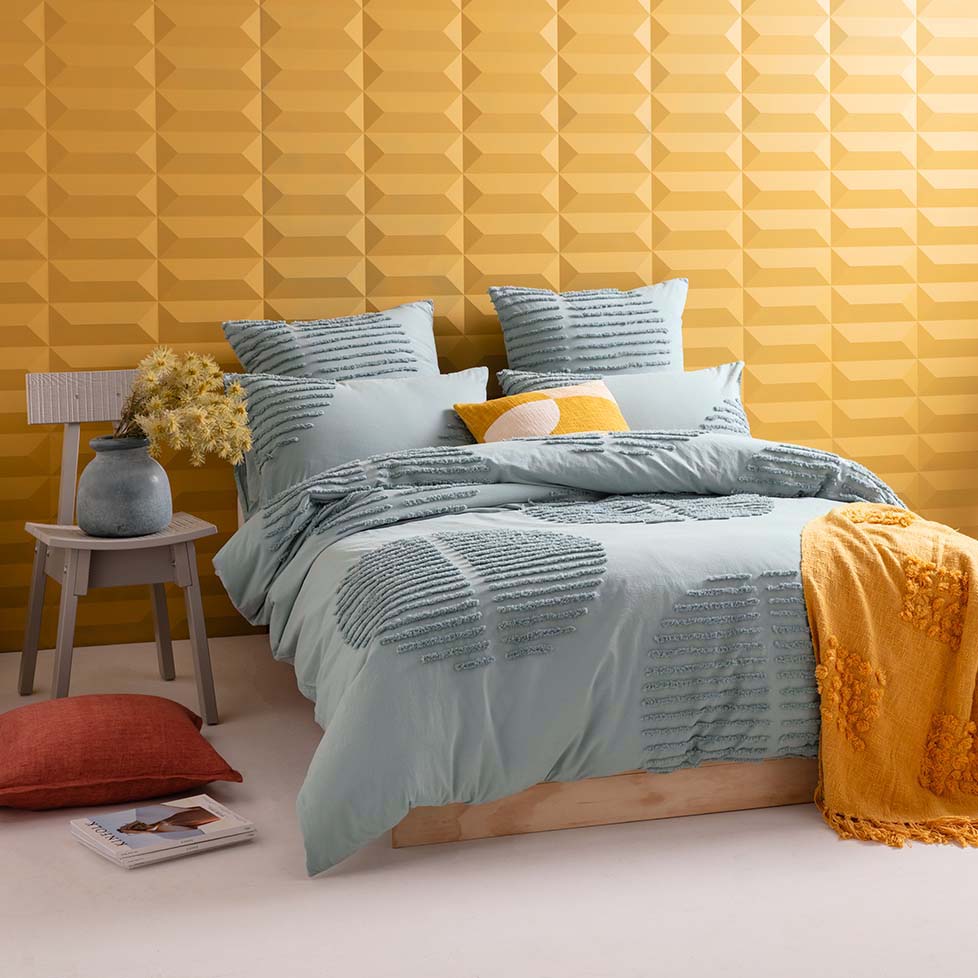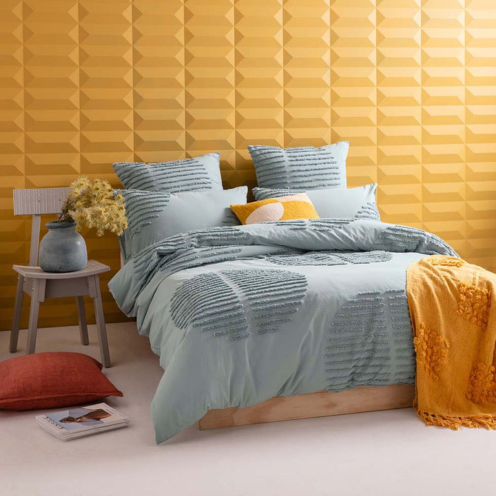 KAS Barlow Seafoam Queen Bed Quilt Cover Set is effortlessly elegant. The Barlow quilt cover will make a dreamy addition to any bedroom. Featuring a raised linear design forming large statement making circles, the timeless tufting technique is tonal in colour, allowing texture to be the hero. Tailored with a knife-edge finish, this quilt cover is sophisticated in its simplicity.