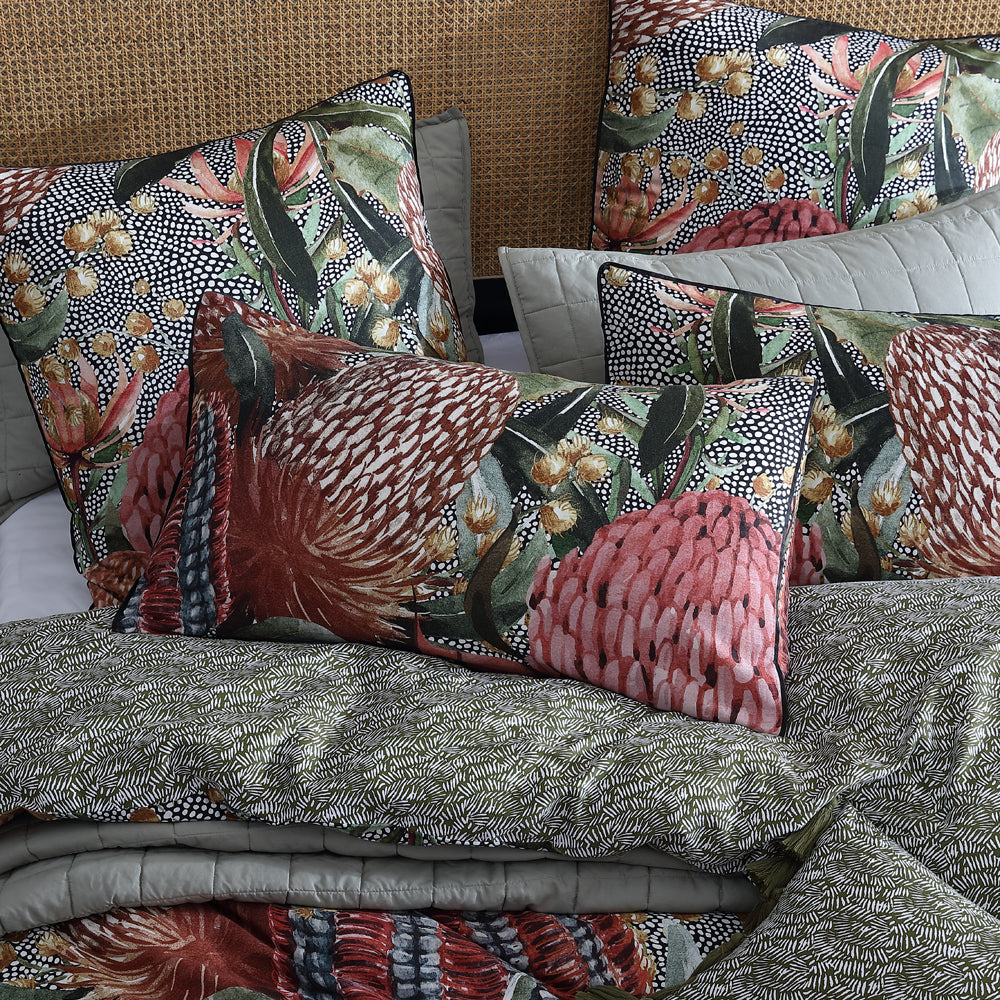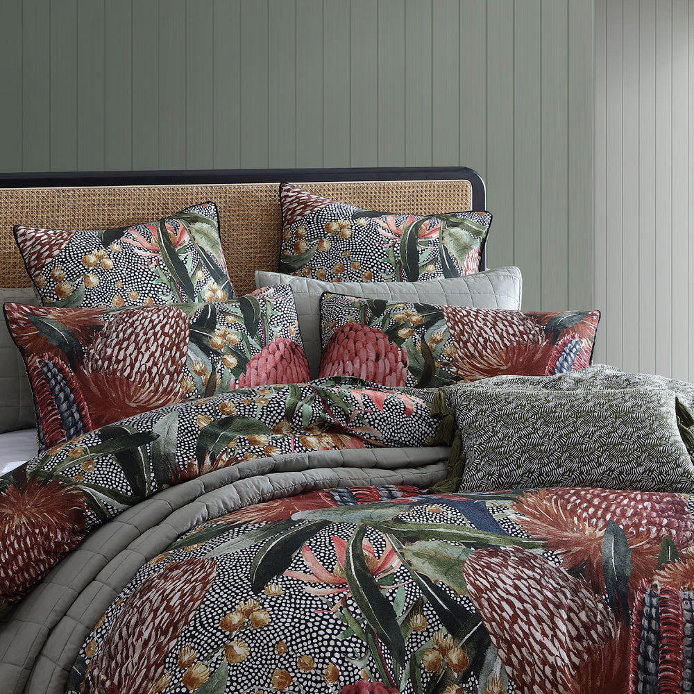 Logan and Mason Barrabar Red Queen bed quilt cover set, large native botanical foliage dominates the design, creating impact in colour and details. An organic stroke contrasts with the reverse and co-ordinate. Barrabar features iconic flowers like the Waratah and Wattle. The colours offer a winter warmth in shades of deep red and are contrasted with the olive and ochre found in their natural environment. The flowers are set against a fun black and white dot and framed by black piping.
