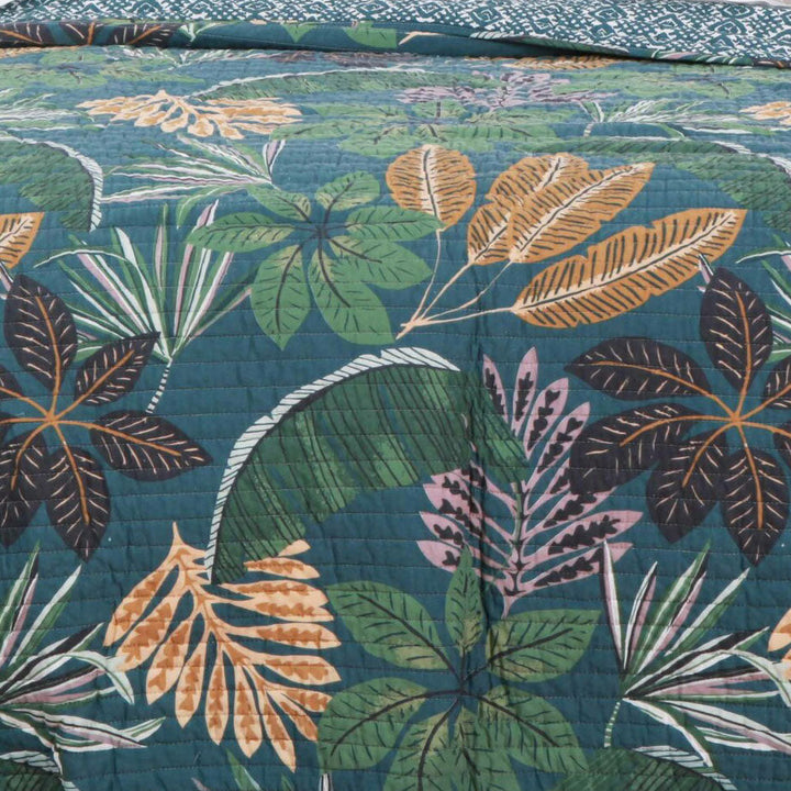 Classic Quilts Beckett King Single Bed Coverlet Set features stunning multicoloured tropical blooms on a green base. The design is printed on a cotton outer, and contains a light-loft cotton fill for breathability and comfort. The reverse is a modern thatched geometric design in the same green hue, to ensure that the coverlet coordinates with your bedroom.
