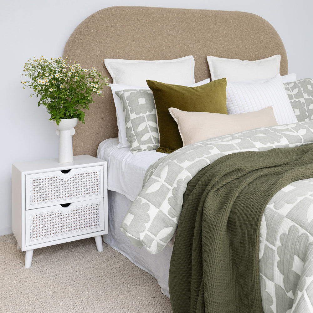 Bambury Bloom Queen Bed Quilt Cover Set is a woven design featuring a captivating checkerboard pattern adorned with an intricate floral motif in shades of white and grey (with a hint of olive green to it!). The reverse side mirrors the muted grey tones of the front, offering a harmonious balance of elegance and tranquility to enhance your bedroom decor.