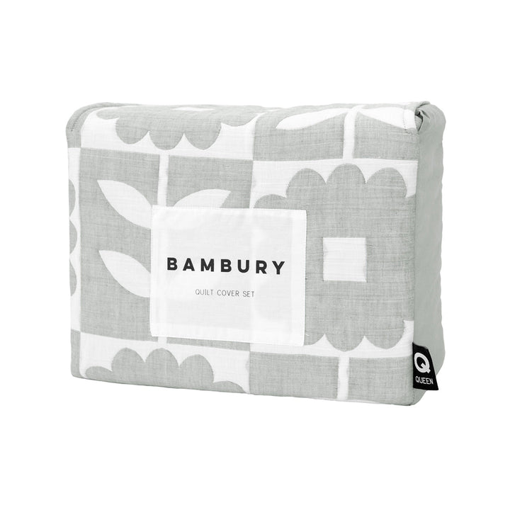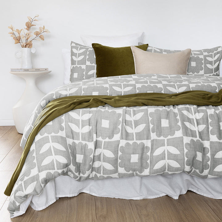 Bambury Bloom Super King Quilt Cover Set is a woven design featuring a captivating checkerboard pattern adorned with an intricate floral motif in shades of white and grey (with a hint of olive green to it!). The reverse side mirrors the muted grey tones of the front, offering a harmonious balance of elegance and tranquility to enhance your bedroom decor.