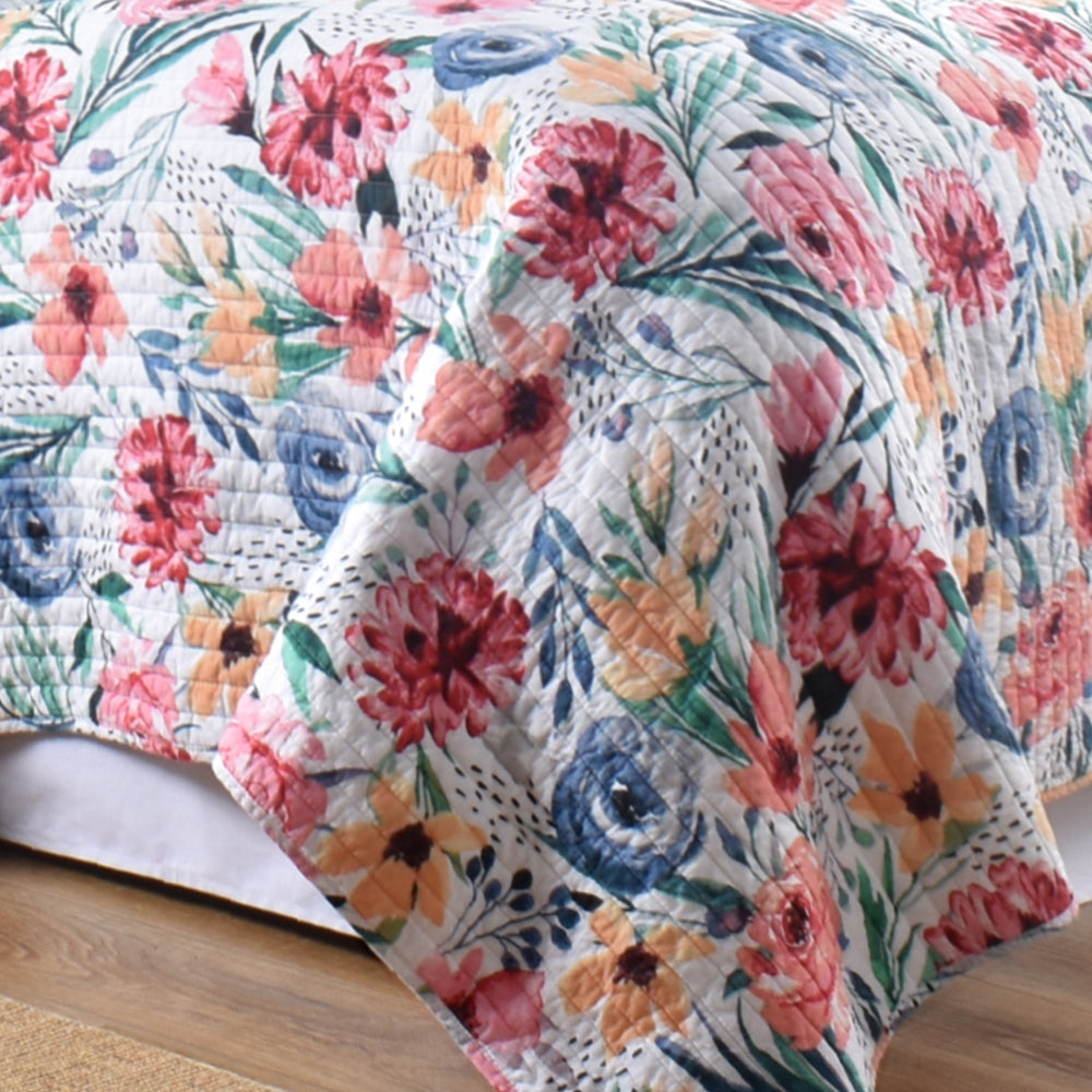 Classic Quilts Blossom Queen Bed Coverlet Set features a lovely floral design. The design is printed on a cotton outer, and contains a light-loft cotton fill for breathability and comfort.