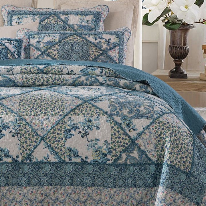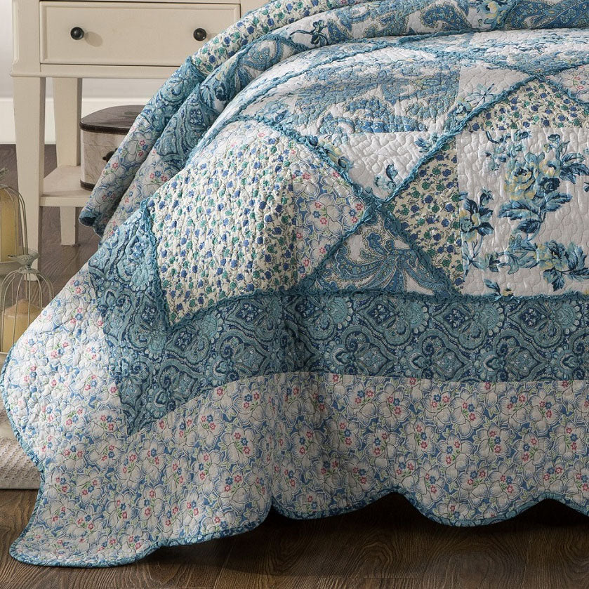 Classic Quilts Blue Bouquet Single Bed Coverlet Set features a beautiful antique sky blue patchwork design on a white background. This set includes a matching pillowcase. This coverlet reverses to a plain blue.