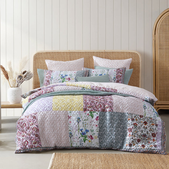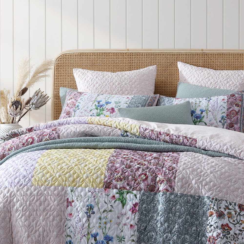 Platinum Logan and Mason Bodhi Pink King Bed Quilt Cover brings nature indoors. Featuring a range of Logan & Mason prints, including floral blooms, silhouettes, Jacobean and damasks overlayed in a patchwork style. With a provincial feel in deep and earthy inspired hues, create warmth within your interior during the colder winter months. An element of texture enhances this design with the use of an organic pattern quilted over the top.