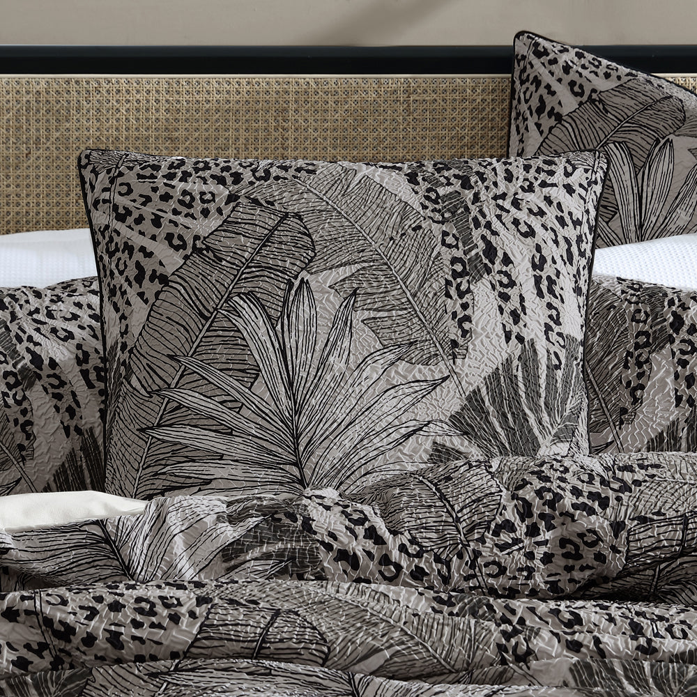 Platinum Logan and Mason Borneo Haze European Size Pillowcase is tropical bliss. Island foliage is printed on heat set crinkle fabric in monochromatic tones creating a dramatic effect. Borneo is elegantly finished with black cord piping to frame the design
