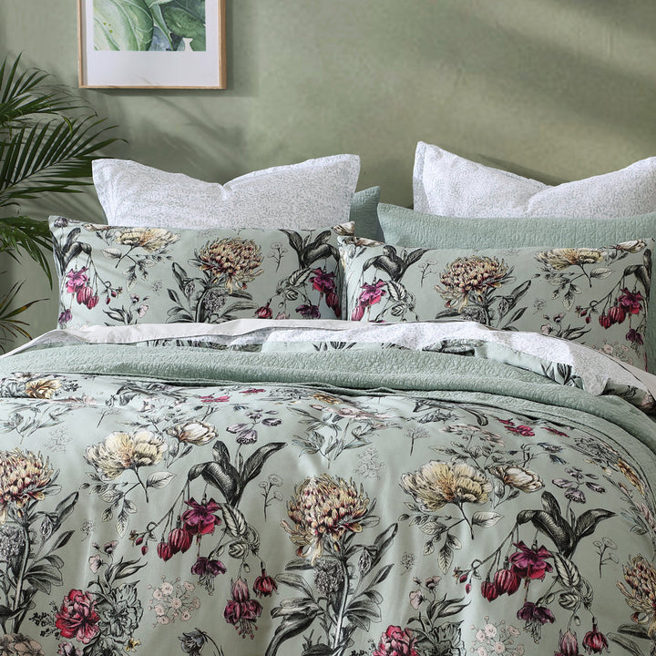 Logan and Mason Botanical Coast Sage King bed quilt cover set is a tranquil oasis beckoning you to embrace the essence of coastal serenity within your bedroom sanctuary. A serene sage base provides a captivating quilt cover, adorned with a hand-drawn collage of flowers and fauna. This intricate design evokes the peaceful allure of a coastal escape, immersing you in a soothing and rejuvenating atmosphere. Adding to its charm, the reverse side features soft sage and white hues, adorned with a delicate pattern of ditzy textured leaves.