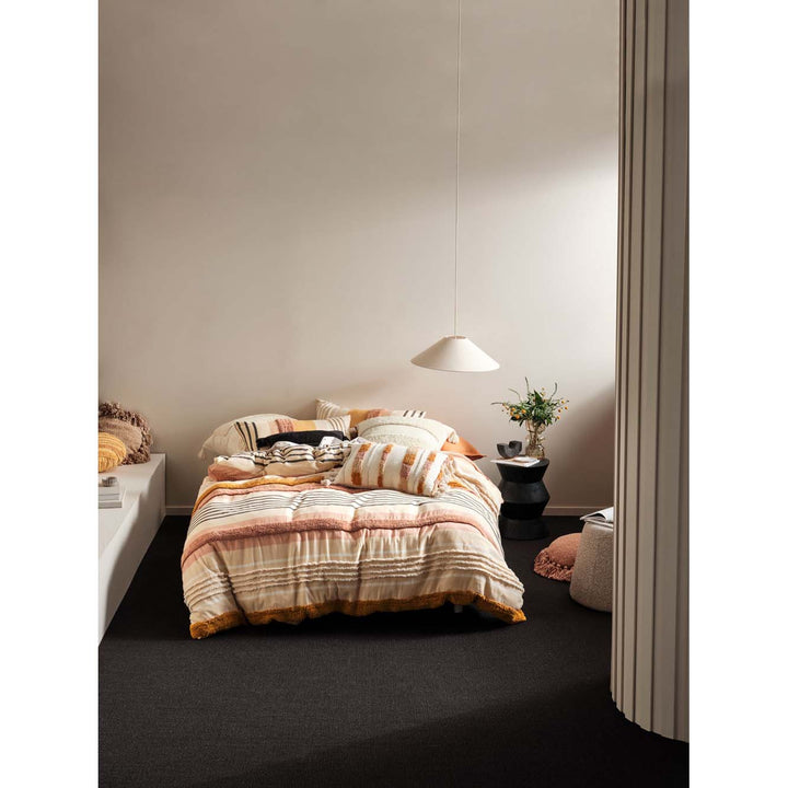 Linen House Briony Brandy Single Bed Quilt Cover Set enjoys a stellar retro style. This quilt cover set is made from sherpa-like tufted chenille in colourful yarn-dyed stripes. Both comfortable and stylish, this set is perfect for your winter boudoir. This ensemble will not only add warmth but also looks the part styled with its coordinating tufted European pillowcases with chic tassels and tufted cushion to complete its nostalgic theme.