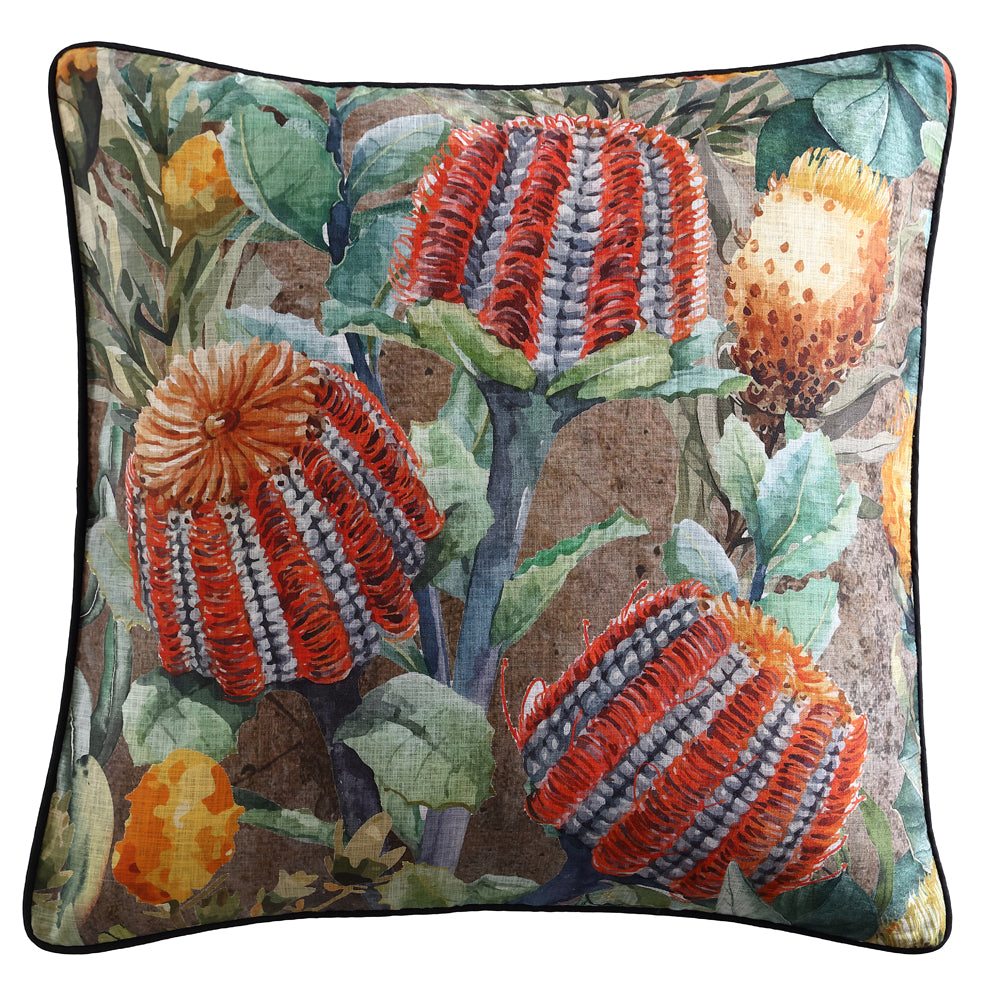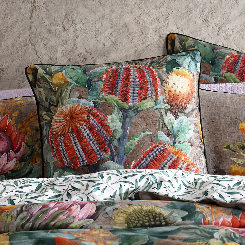 Logan and Mason Bronte european pillowcase is a haven of natural beauty featuring Australian flora. This exquisite design showcases vibrant Banksia flowers and striking Waratah blooms, bringing a touch of the Australian wilderness into your home. The background is adorned with subtle textures in natural hues, creating a serene and earthy palette that complements any décor.