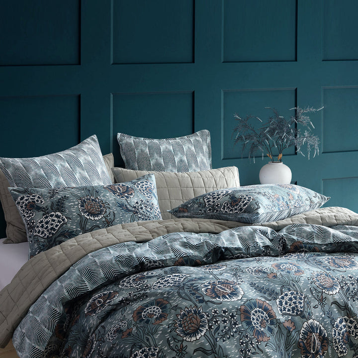 Logan and Mason Cape Conran Teal King bed quilt cover set is a dramatic and detailed floral repeat that depicts hand drawn illustrations. Referencing a coastal cool floral and texture, which are given a modern twist with the calm and tranquil colour palette. A contemporary herringbone print for the reverse makes an impact that is not easily forgotten and pairs famously with the warm taupe herringbone tape that finishes the quilt to an elite status.