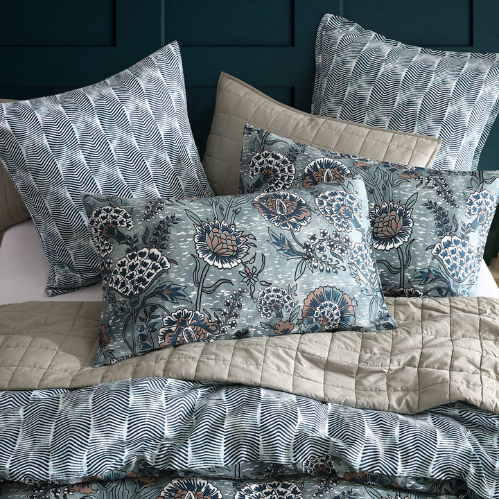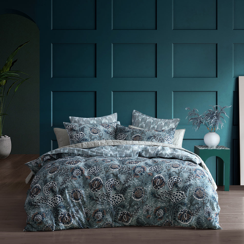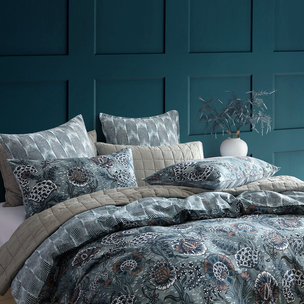 Logan and Mason Cape Conran Teal Queen bed quilt cover set is a dramatic and detailed floral repeat that depicts hand drawn illustrations. Referencing a coastal cool floral and texture, which are given a modern twist with the calm and tranquil colour palette. A contemporary herringbone print for the reverse makes an impact that is not easily forgotten and pairs famously with the warm taupe herringbone tape that finishes the quilt to an elite status.