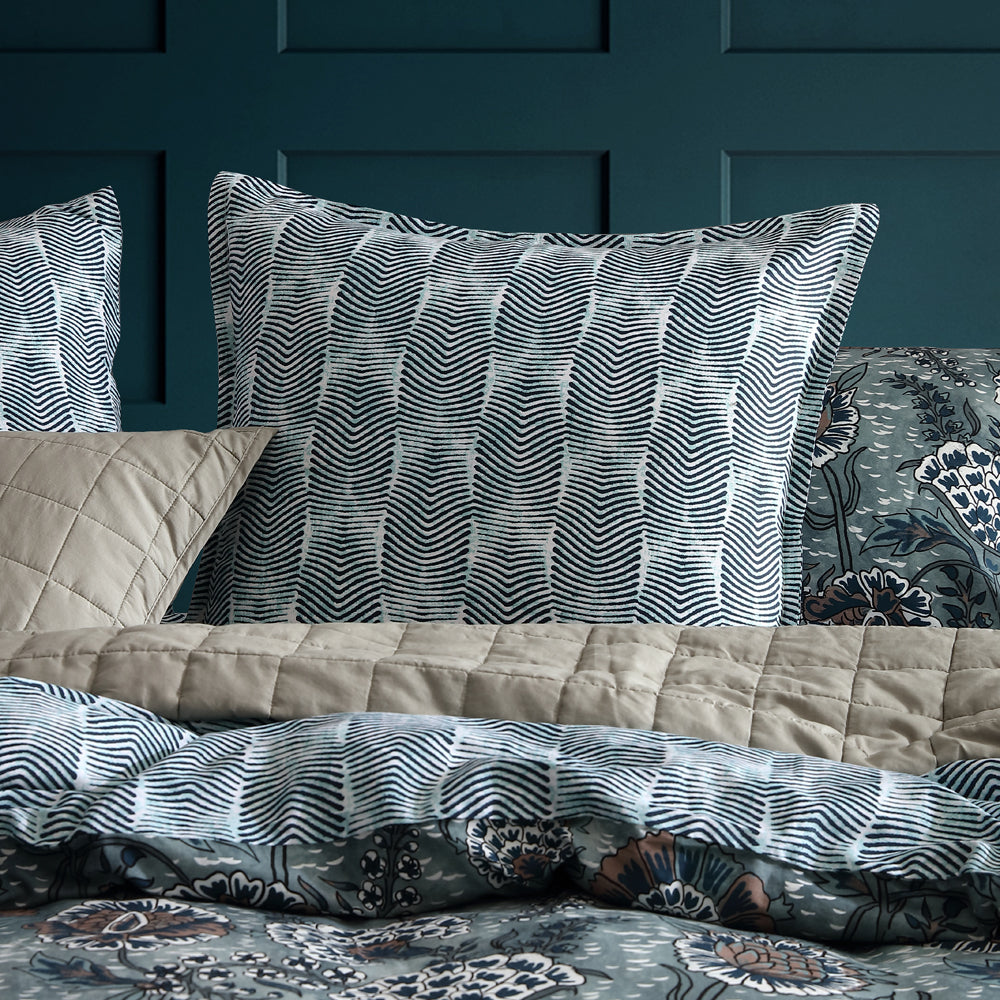 Logan and Mason Cape Conran Teal Super King quilt cover set is a dramatic and detailed floral repeat that depicts hand drawn illustrations. Referencing a coastal cool floral and texture, which are given a modern twist with the calm and tranquil colour palette. A contemporary herringbone print for the reverse makes an impact that is not easily forgotten and pairs famously with the warm taupe herringbone tape that finishes the quilt to an elite status.