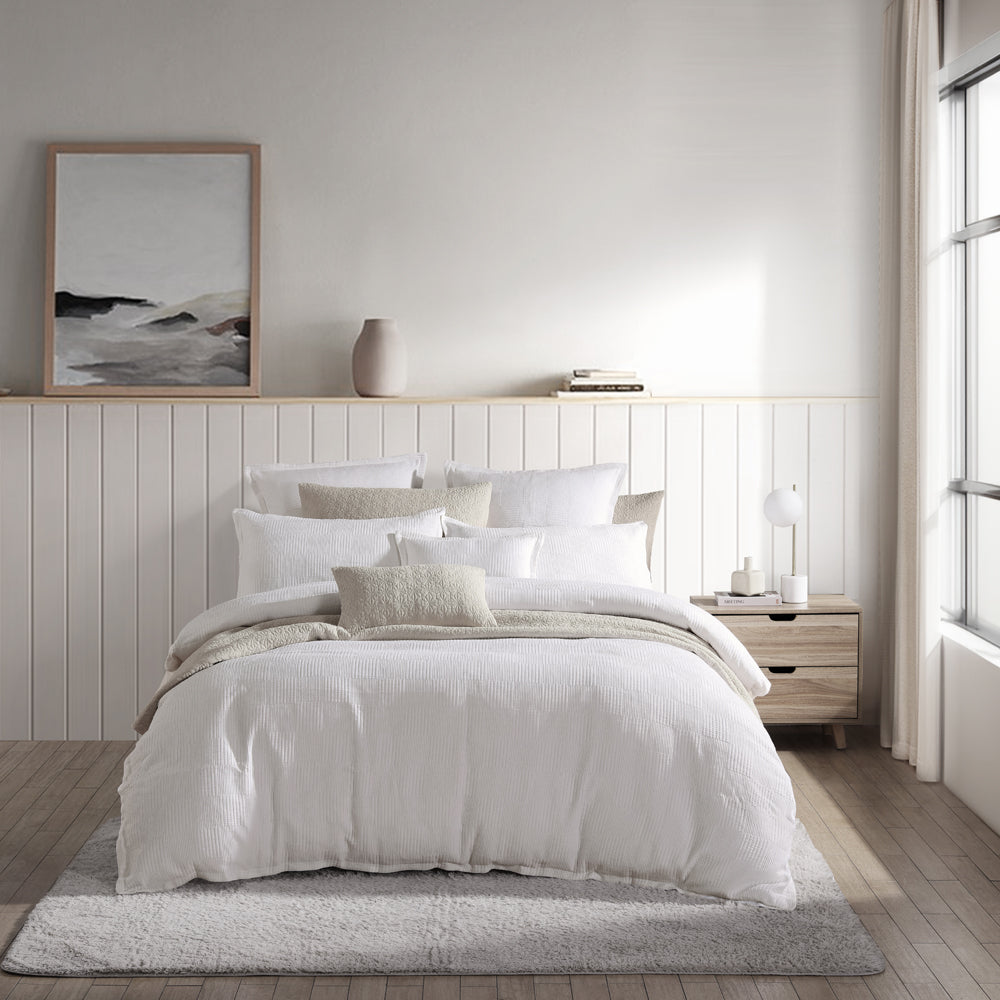 Platinum Logan and Mason Caspian White Super King Quilt Cover is a contemporary take on a timeless and refined look, Caspian is created using the matelasse technique. Presented in alternating stripe widths within a small check, this design is a delightful addition of pattern and texture. Elevate your bedroom styling with the crisp tonal Ivory, which is the perfect pairing to your favourite accent cushions.