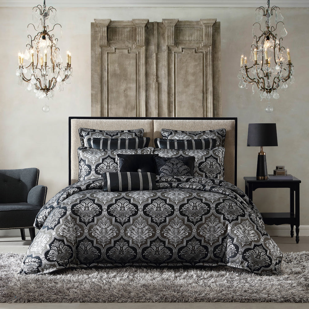Davinci Chamonix Silver Super King Quilt Cover Set is the pinnacle of classic bedroom style. Featuring large scale and highly stylised damask motifs in black and silver, Chamonix is elegantly finished with a tailored self-flange and twisted rope cord. Reversible European pillowcases allow for flexible styling options with damask jacquard one side contrasted against a stripe on the other. The co-ordinating feature cushions add another level of luxury to this Italianesque Winter design.