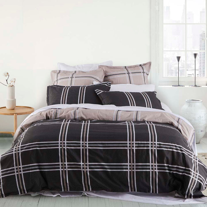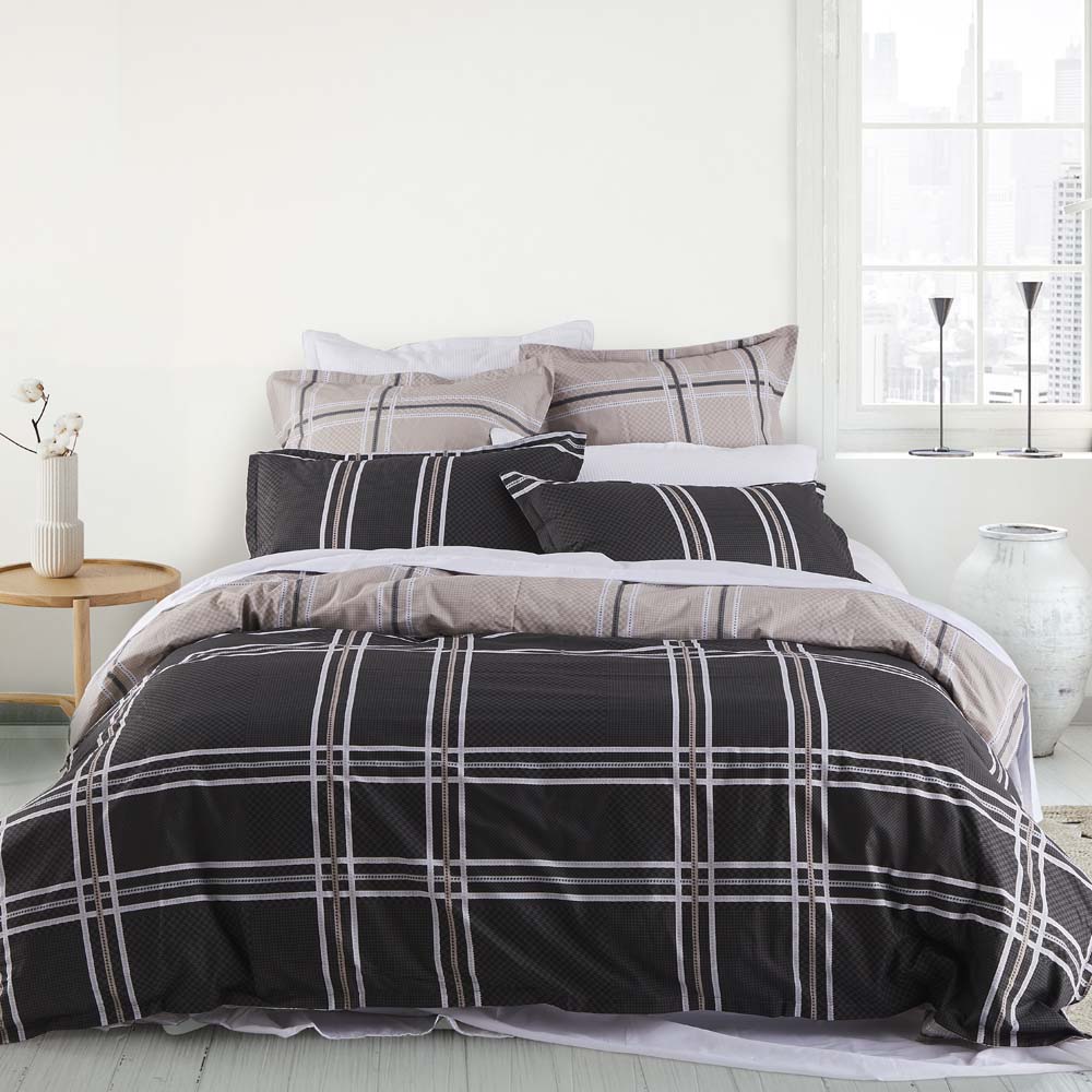 Logan and Mason Charlie Slate Single Bed Quilt Cover Set gives you two looks in one. A combination of classic checks and houndstooth is given a contemporary reworking using multiple scales and a smart, versatile palette. Simply reverse the cover for different styling options.