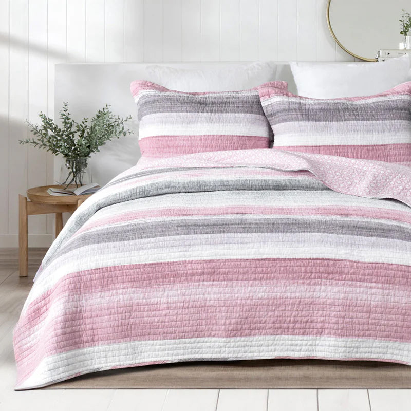 Classic Quilts Chelsea King Bed Coverlet Set transforms your bedroom with its soft elegance. Made from 100% cotton, this coverlet offers both comfort and breathability, ensuring a restful night's sleep. The design features a soothing palette of pink, white, and grey stripes, creating a serene and inviting atmosphere. The slightly quilted texture adds depth and warmth, perfect for year-round use. This set not only enhances your bedroom decor but also provides cozy comfort with its high-quality craftsmanship. Elevate your sleep space with the Chelsea Coverlet Set and enjoy a perfect blend of style and relaxation.