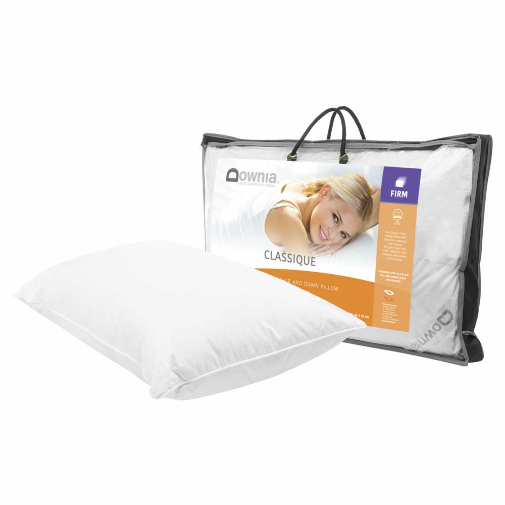 Our classic style firm profile pillow filled with luxurious 30% white duck down and 70% duck feather for both softness and support for your head and neck. Luxury downproof cotton casing.