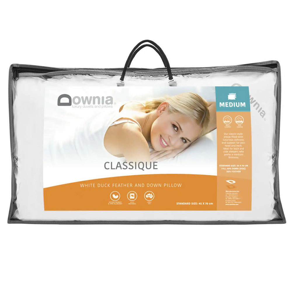 Our classic style king size pillow filled with luxurious 50% white duck down and 50% duck feather for both softness and support for your head and neck. Luxury downproof cotton casing.