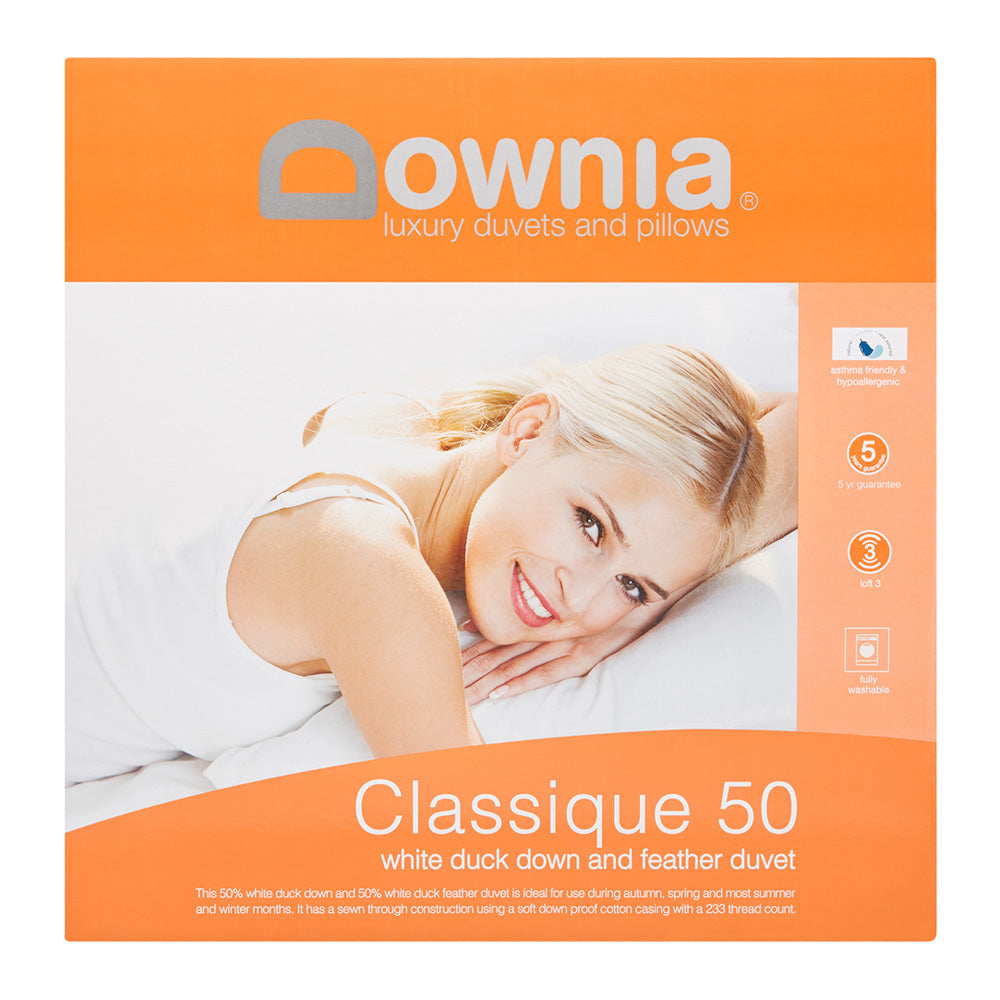 This white duck down and feather single bed duvet is ideal for use in Autumn, Spring and warmer Winter months. It has a sewn through construction using a soft high thread count cotton down-proof casing. 50% White Duck Down and 50% White Duck Feathers. Sewn through cassette construction. 5 year guarantee. Down proof cotton casing with 233 thread count fabric.