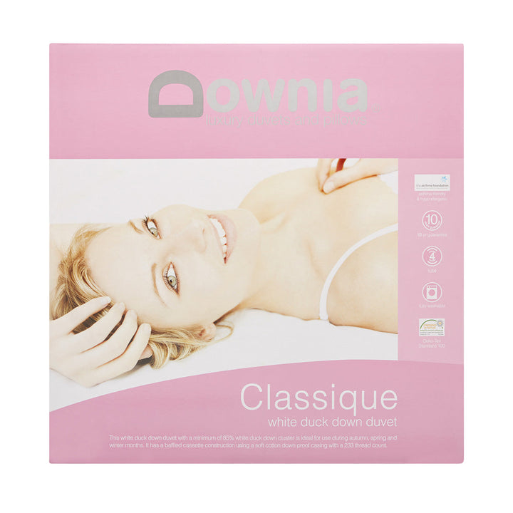 This white duck down queen bed duvet is ideal for use in Autumn, Spring and Winter months. It has a baffled cassette construction using a soft high thread count cotton down-proof casing. Baffled cassette construction. 10 year guarantee. Down proof cotton casing with 233 thread count fabric. Decorative piping.