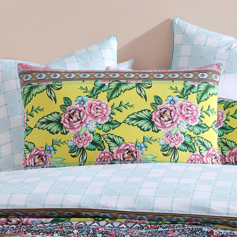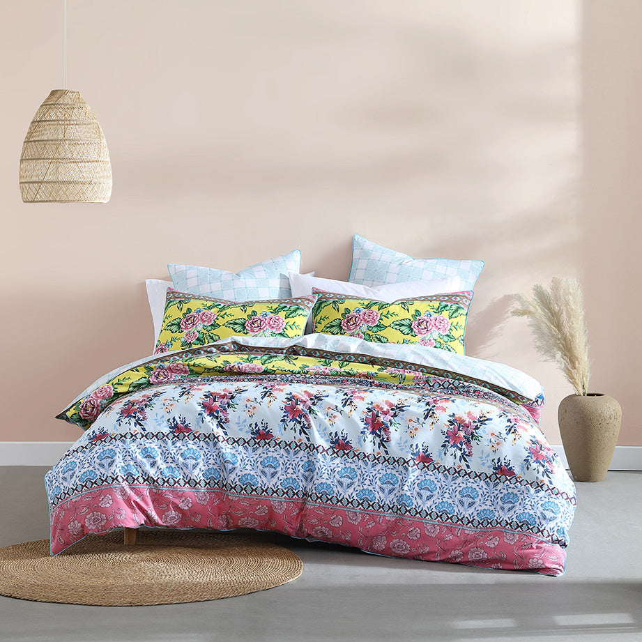 Logan and Mason Clover Spring Single Bed Quilt Cover Set will be the essence of your room with these eclectic patterns that complement each other. Detailed printing allows for simulated hand stitch looks between the panels. Clover is piped in a contrast of aqua and picnic style check on the reverse. Think Frida Kahlo, bright flowers, and tiled geometric patterns; and you are transported to a Californian meets Mexican kind of vibe.