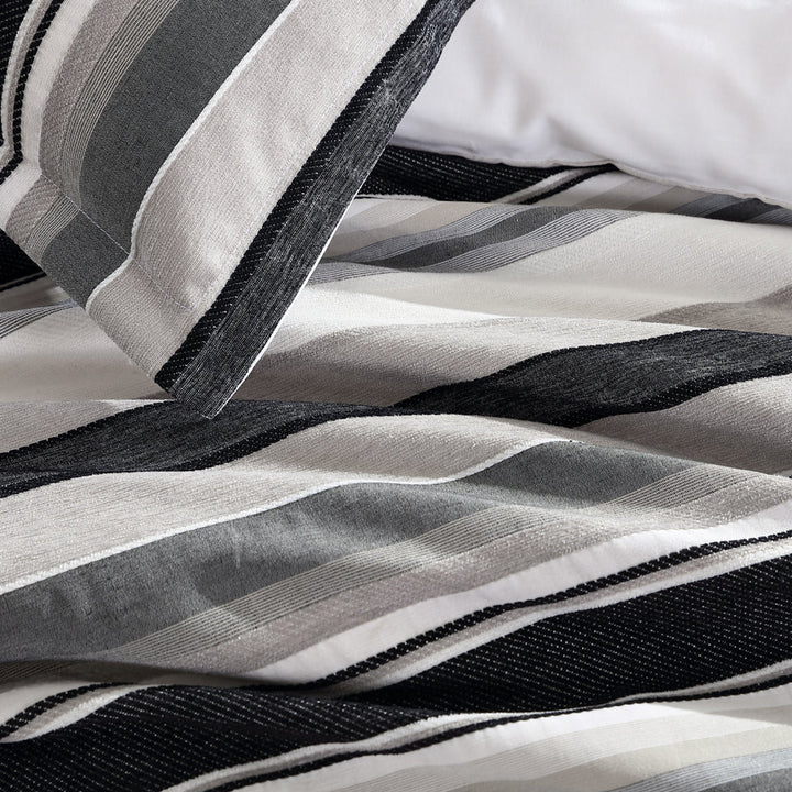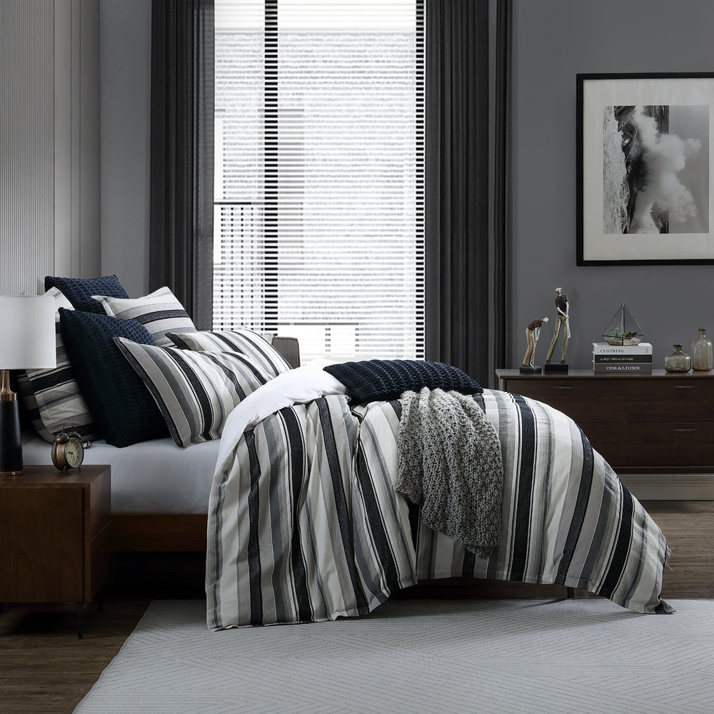 Private Collection Colby Steel King Bed Quilt Cover Set brings warmth to the bedroom. Horizontal stripes, woven in a medley of textures, combined with the softness of chenille, adds a new dimension to a classic theme. Dress with Colby's matching european pillowcases to heighten the look.