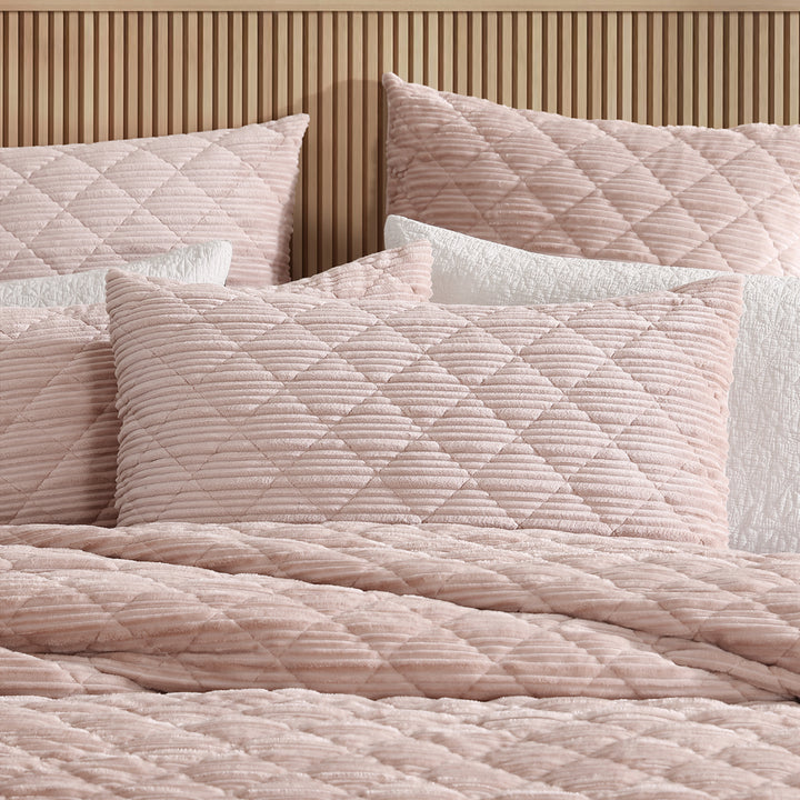 Corbin Blush Queen Bed Quilt Cover Set combines classic corduroy rib stripes with a contemporary velvet fabric, offering both texture and visual appeal. The graphic diamond quilted pattern introduces an additional layer of dimension, enhancing its rich texture. This quilt cover set is the ultimate choice for adding both comfort and sophisticated style to your interior.