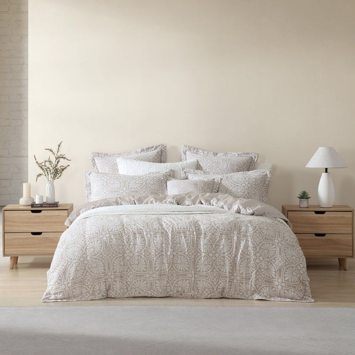 Private Collection Dakota Stone Queen Bed Quilt Cover is inspired by the popular trend Boho and mixes tribal, ornamental and ethnic aesthetic to create a mandala tile repeat. The design incorporates a simple plain dyed attached flange that creates a refined finish to the overall design. In organic and natural colour options of Fog and Stone, you will be able to pair this beautiful design with any colour palette.