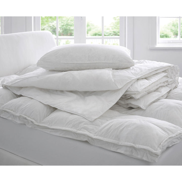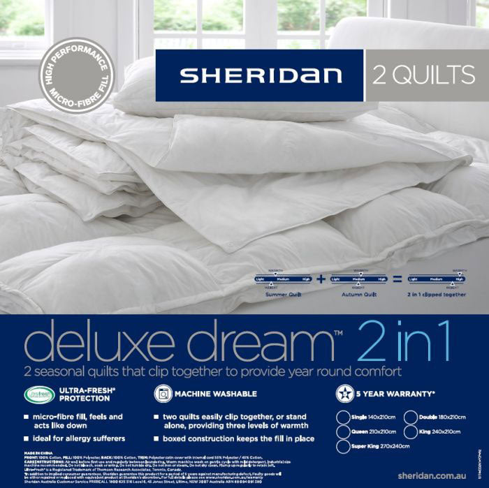 The Sheridan Deluxe Dream 2 in 1 King Bed Quilt was designed for those who seek easy care, or with allergies who still want the look and feel of a feather and down quilt, with its antibacterial treatment. This versatile set includes two quilts of different weight variances, which can be separated or clipped together, making it perfect for all seasons use.
