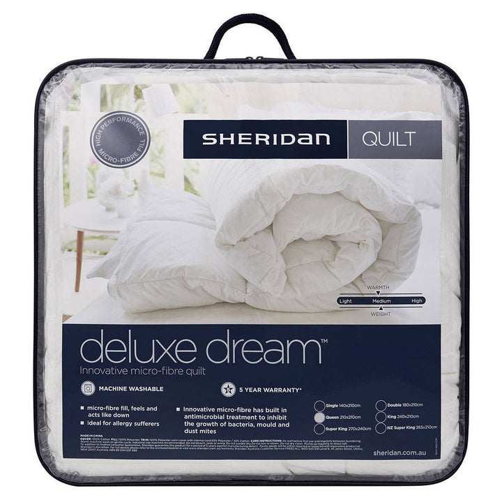 The Sheridan Deluxe Dream Super King Quilt is designed for those who want easy care plus a soft, down-like feel, but for allergy reasons need antibacterial benefits. Featuring a premium quality polyester fill with an antibacterial treatment and a box cassette stitch design, providing an even spread of warmth. Great for all seasons, our Deluxe Dream Quilt is versatile in its nature with its lightweight design, whilst maintaining maximum loft and fullness.