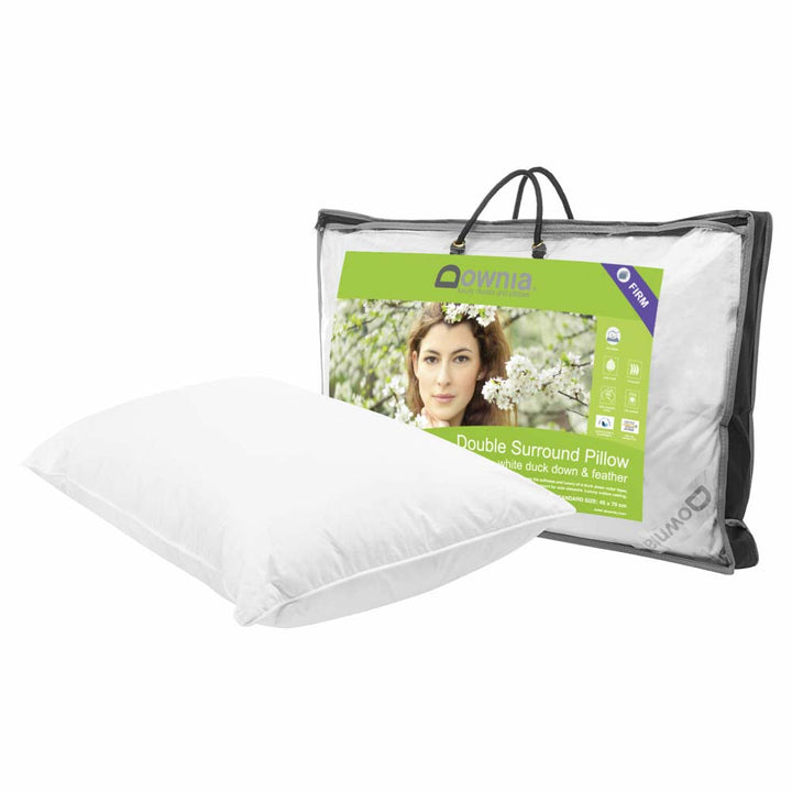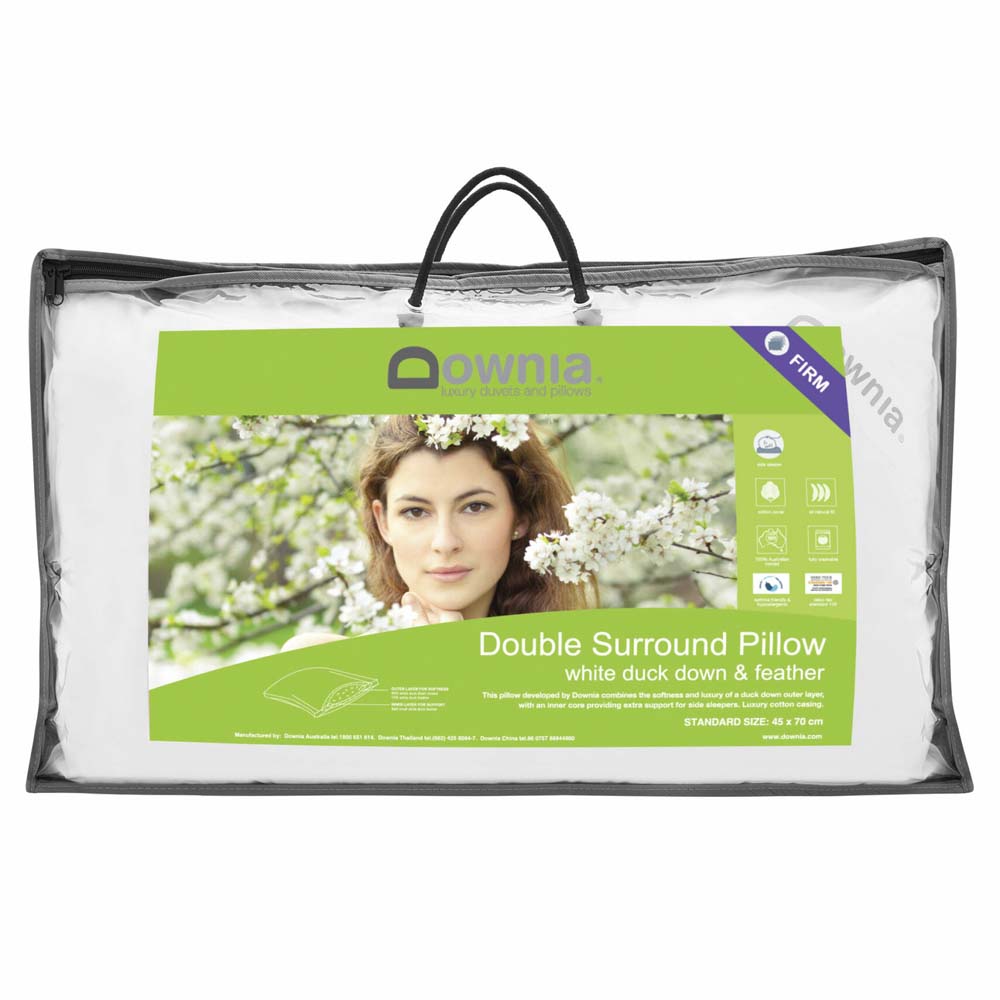 Downia Double Surround Collection Standard Size Firm Pillow is ideal for side sleepers. This triple chamber surround pillow is designed to provide optimal neck support without compromising softness and comfort. It contains the luxurious softness of a duck down surround outer layer with the extra support of a feather core.