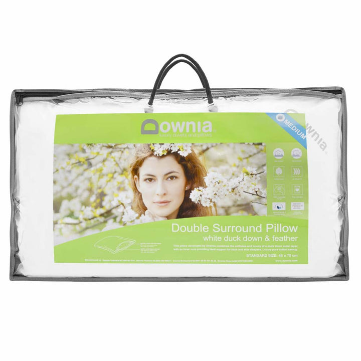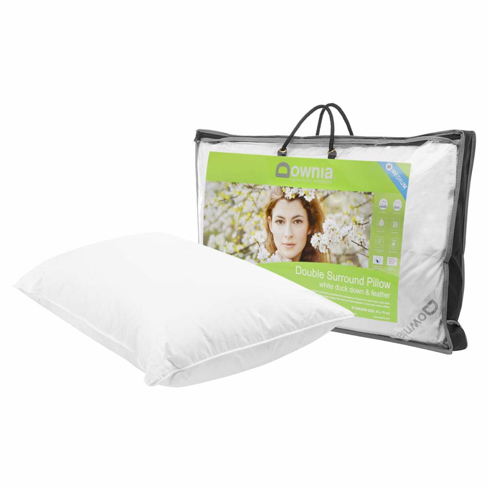 Downia Double Surround Collection Standard Size Medium Pillow is ideal for side and back sleepers. This triple chamber surround pillow is designed to provide optimal neck support without compromising softness and comfort. It contains the luxurious softness of a duck down surround outer layer with the extra support of a feather core.