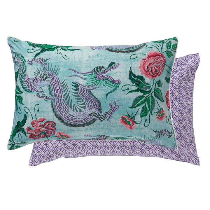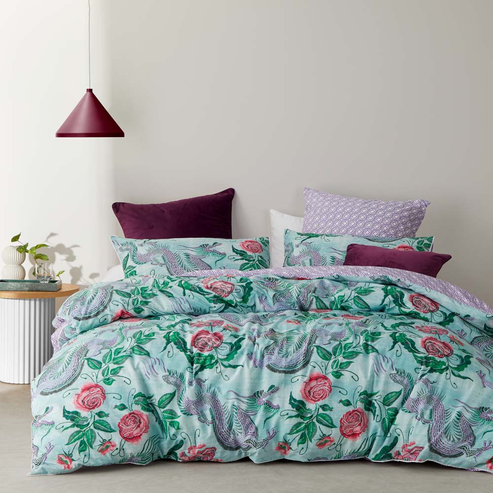 Logan and Mason Dragon Jade King Bed Quilt Cover Set combines Eastern mystique with a touch of femininity. Symbolic dragons weave their way through a field of peonies with contours cleverly printed to resemble embroidery stitches. The cover reverses to an Oriental-style geometric for co-ordinated contrast.