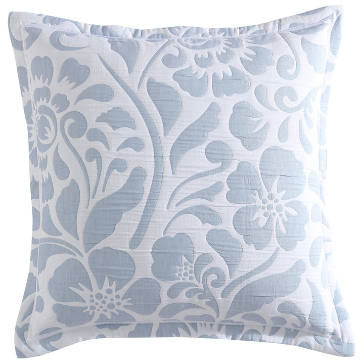 Private Collection Eleanor Sky European Pillowcase is a picturesque floral motif, Eleanor portrays the look of a modern Jacobean. Featuring a classic Private Collection woven construction, the matte appearance makes the over scaled floral motifs in blue pop against the calm white. Stylishly finished with a white grosgrain tape and tailored self-flange, Eleanor will pair famously with coordinating textures.