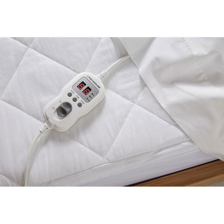 Be extra warm and cosy with Linen House Queen Bed Quilted Multi-Zone Electric Blanket. Smart, safe and practical that suits everyone's individual needs. Allows for heating in separate zones, cosy feet zone and body zone with its 9 setting heat control and duel controls for individual comfort. Quilted multi-zone electric blanket features: Illuminated dial and LED display Timer setting - Up to 12 hours Zone heating - 9 setting heat control Overheat Protection Removable quilt topper Includes: 2 Year Warranty.All electric blankets and throws sold in Australia must comply with strict safety standards administered by Energy Safe Victoria (ESV). This product meets the Electricity Safety Act 1998 with each size a nationally registered model as follows:Queen: LHB2004 (153cm x 200cm + 50cm)