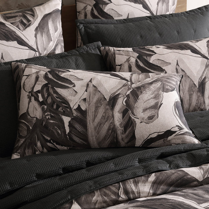 Logan and Mason Elio Black Super King quilt cover set, the leaves are set against a textural printed linen, that evokes the look of linen but offers the softness of cotton sateen. The reverse is folded back to reveal a co-ordinate ikat pattern and is finished with piping. Elio offers a serene atmosphere of lush exotic foliage to adorn any bedroom.