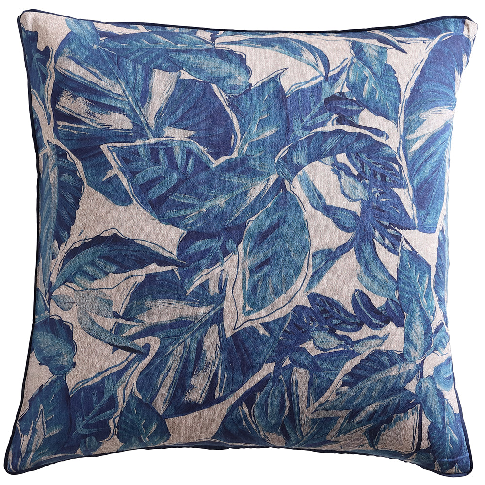 Logan and Mason Elio Blue european pillowcase, the leaves are set against a textural printed linen, that evokes the look of linen but offers the softness of cotton sateen. Elio offers a serene atmosphere of lush exotic foliage to adorn any bedroom.