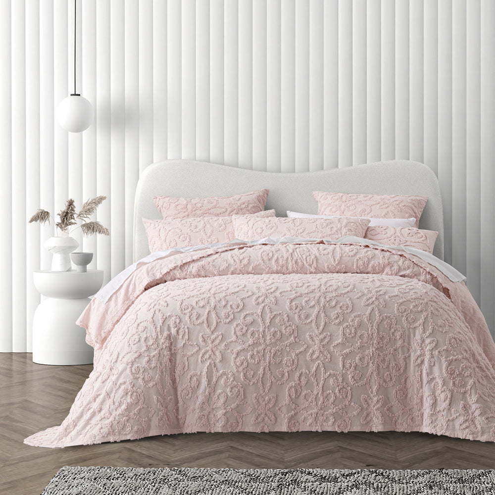 Bianca Ella Blush King Bed Bedspread Set features a super soft cotton chenille fabric that has been carefully selected by our design team to create this absolutely beautiful bedspread. A stunning textured motif pattern covers the entire bed. Available in blush and white, this easy-care bedspread is one that you will love.